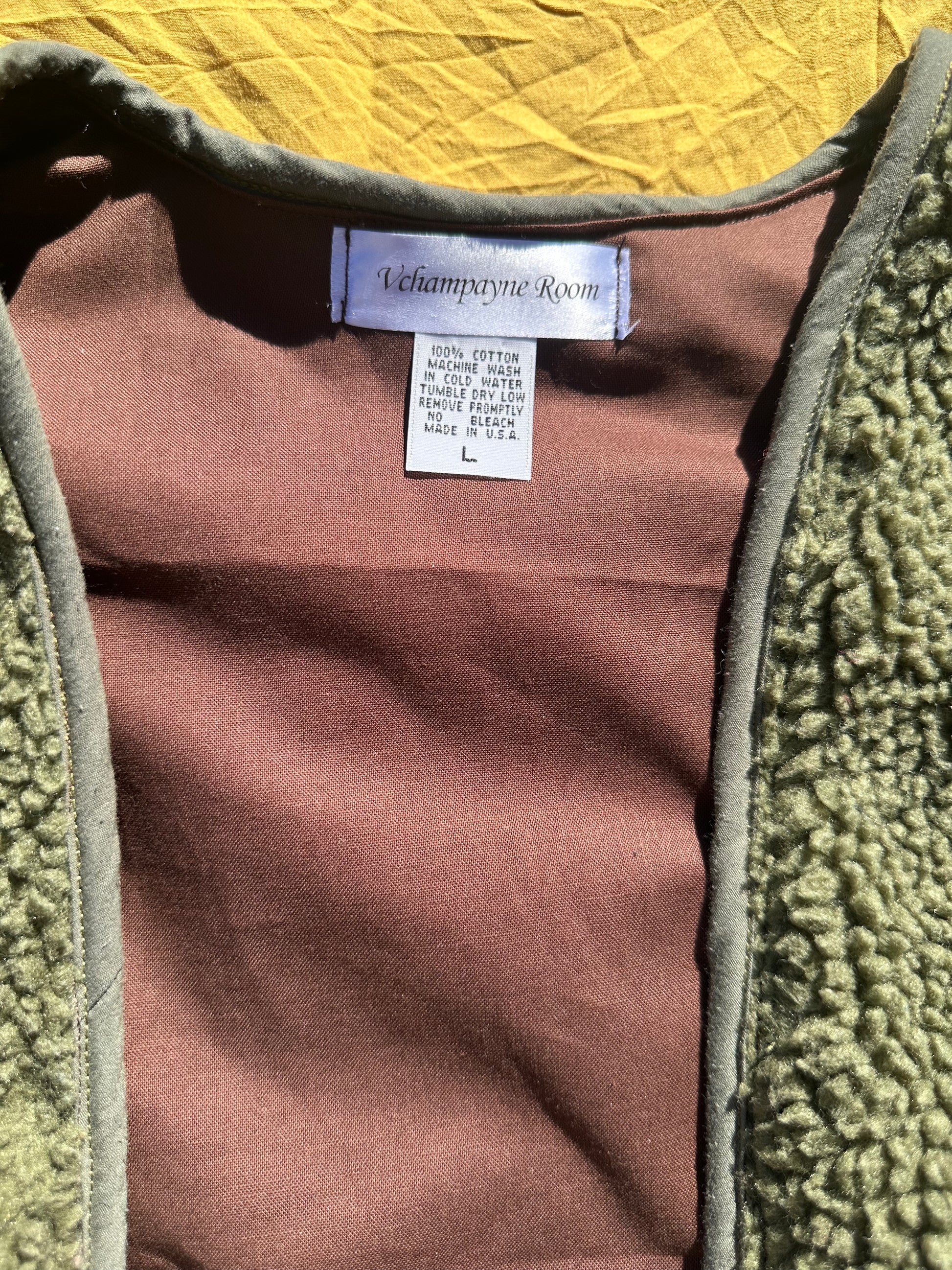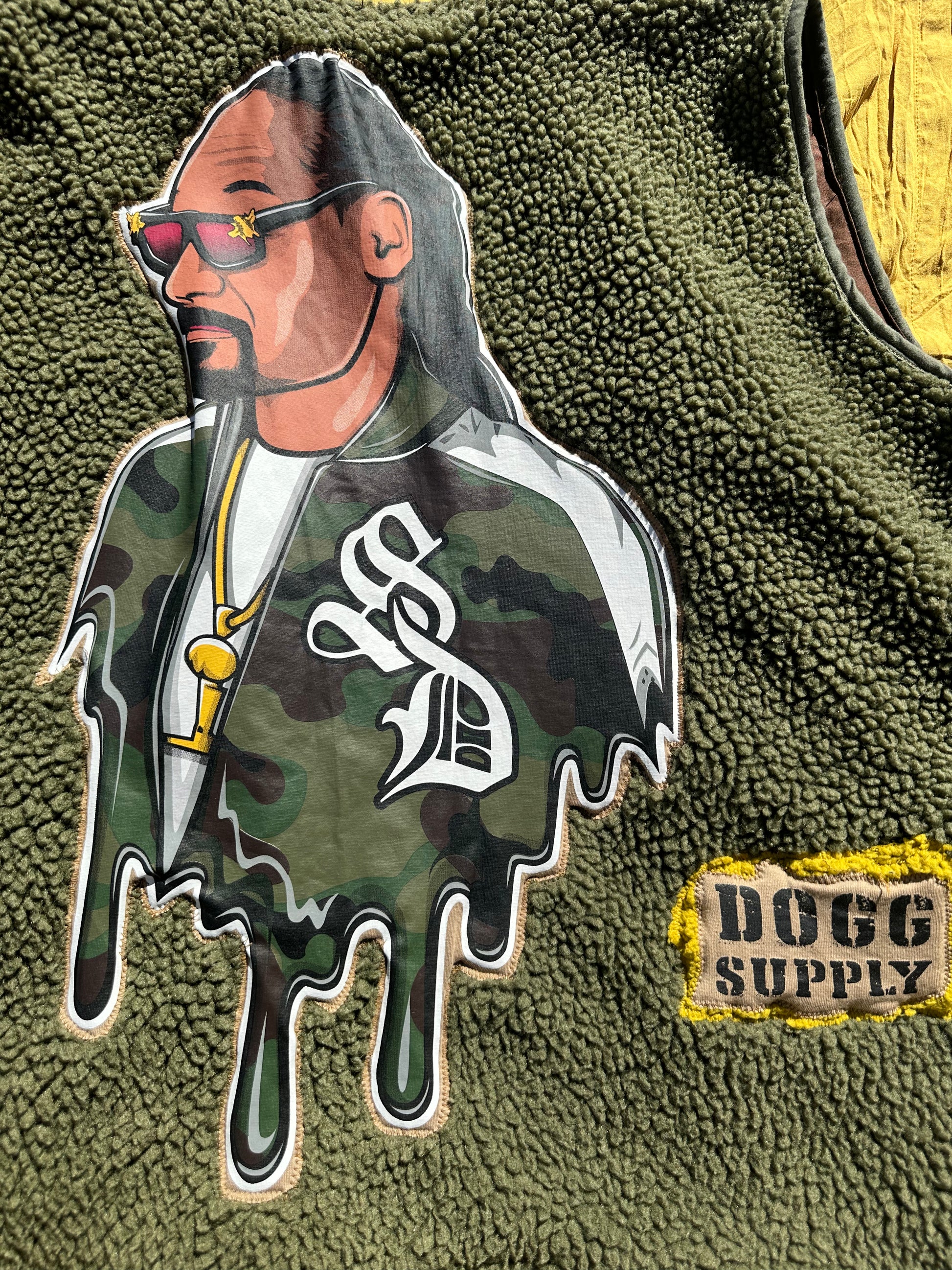 This was a Snoop Dogg supply t shirt turned into a vest. The vest is an olive tone teddy fleece vest made of polyester. The inside is 100% cotton. The color is a chocolate brown. The front pockets are made of a mustard teddy fleece and a camouflage material. The size of the vest is a Large